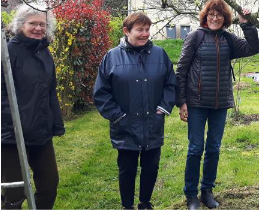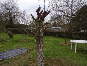 L’après-midi , c’était à Azay sur Thouet que l’on a surgreffé un poirier déjà grand dans le but de changer sa variété qui ne convenait plus. Le but était aussi d’apprendre la greffe en couronne. Les grandes branches furent sciées et dans une bonne ambiance, tous , hommes et femmes, se sont entraînés à greffer en couronne avec différentes variétés, malgré la pluie intermittente. Vous trouverez ci jointes les photos de croqueuses apprenties greffeuses ainsi que celles de l’arbre avant et après.